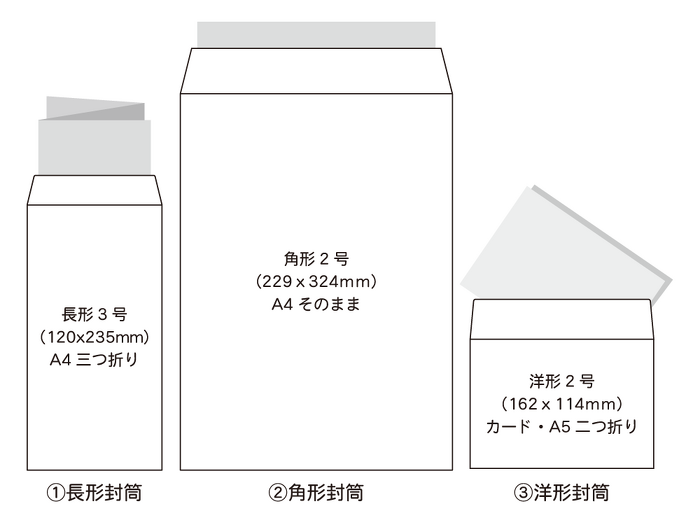 一般的に封筒には、主に➀長形封筒、②角形封筒、③洋形封筒の3種類があります。