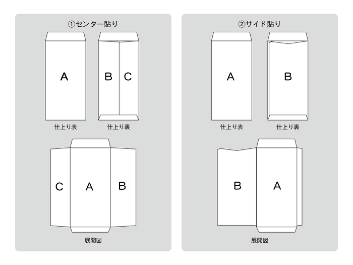 センター貼りもサイド貼りも表面は似ているため一見は同じように見えますが、この2つは裏面の貼り合わせ位置が異なります。センター貼りは真ん中で、サイド貼りは左右どちらかの端で貼り合わせています。また、貼り合わせる位置が異なるため、封筒を展開した形(展開図)も異なります。