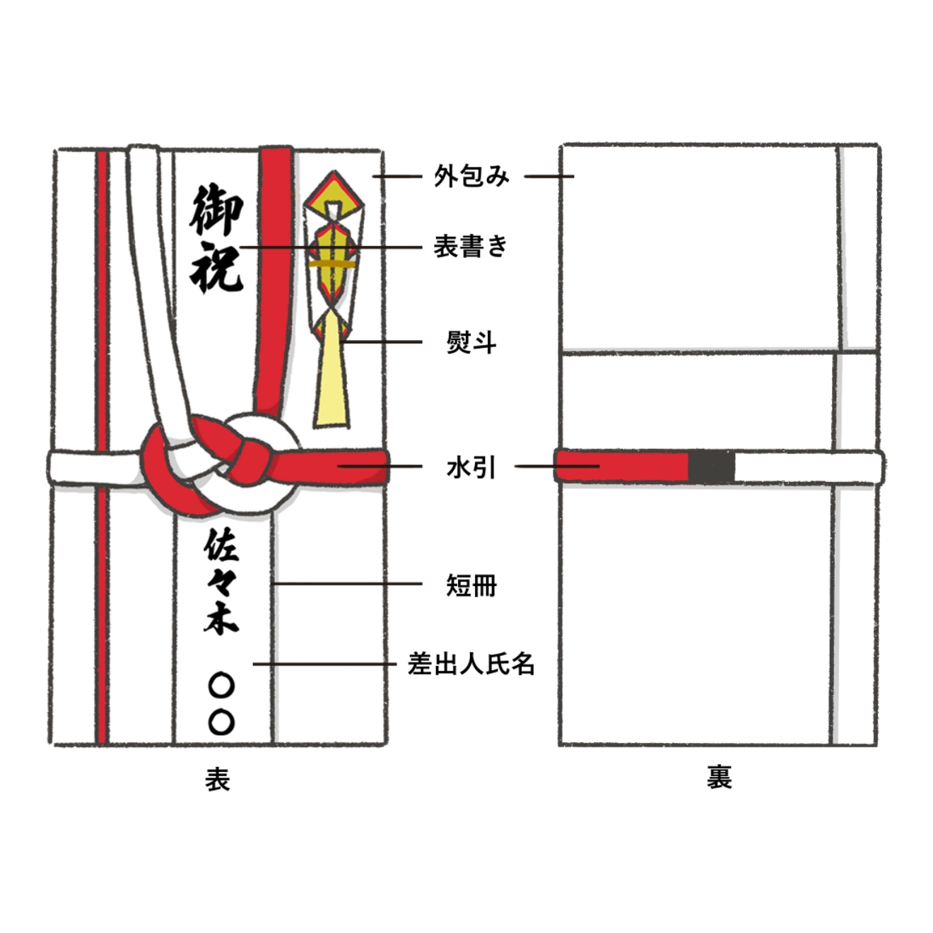 水引付きの祝儀袋の場合は「短冊(たんざく)」と呼ばれる細長い紙に、印刷金封の場合は外包みや封筒の表面に、あらかじめ表書きが印刷されていることもあります。使用シーンに合ったものをお選びください。