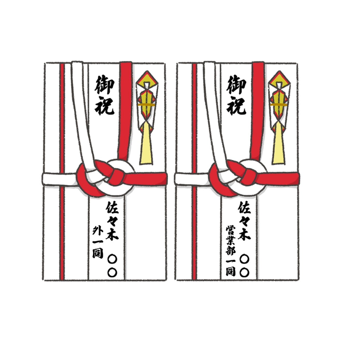 表書きの下に代表者の氏名を書き、その左側にやや小さく「外一同」と書きます。会社やサークル等団体で贈る場合は、表書きの下に「〇〇一同」と書きます。別紙に全員の氏名を書き、お金と一緒に同封します。