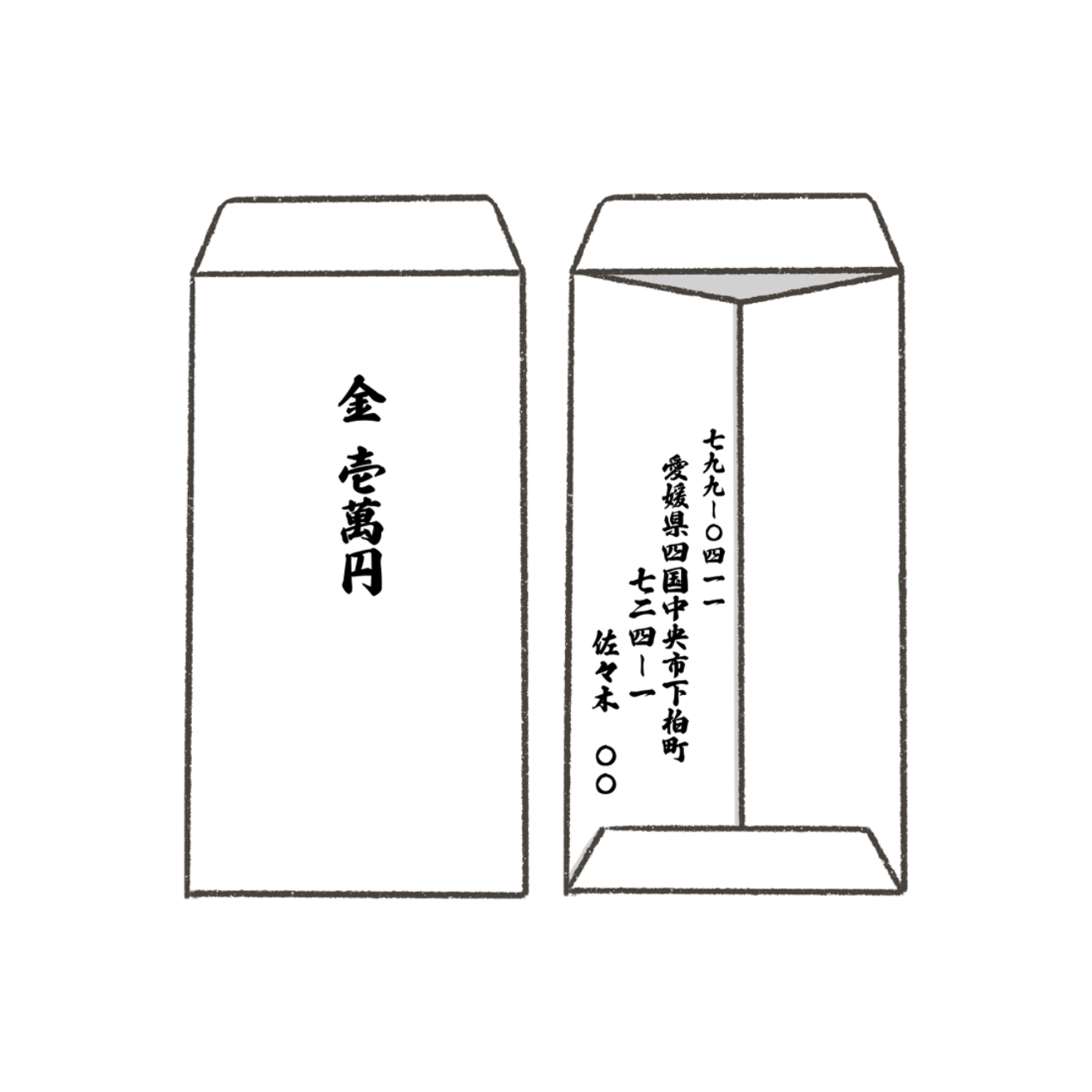 表面の中央に縦書きで「金 〇〇円」と金額を漢数字で書き、裏面の左下に差出人の氏名と郵便番号・住所を書きます。
