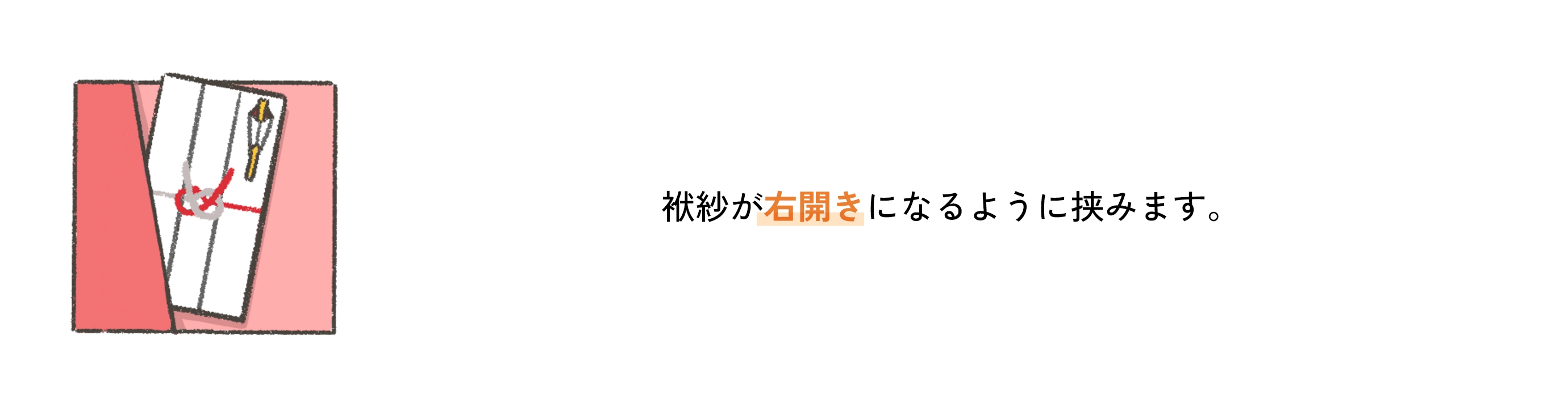 東京折の場合は、イラストのように外包みの上側の折り返しだけを外して中袋を差し込むと、水引を取り外さずに中袋を入れることができます。この時、外包みと中袋の表面と上下が合うようにご注意ください。