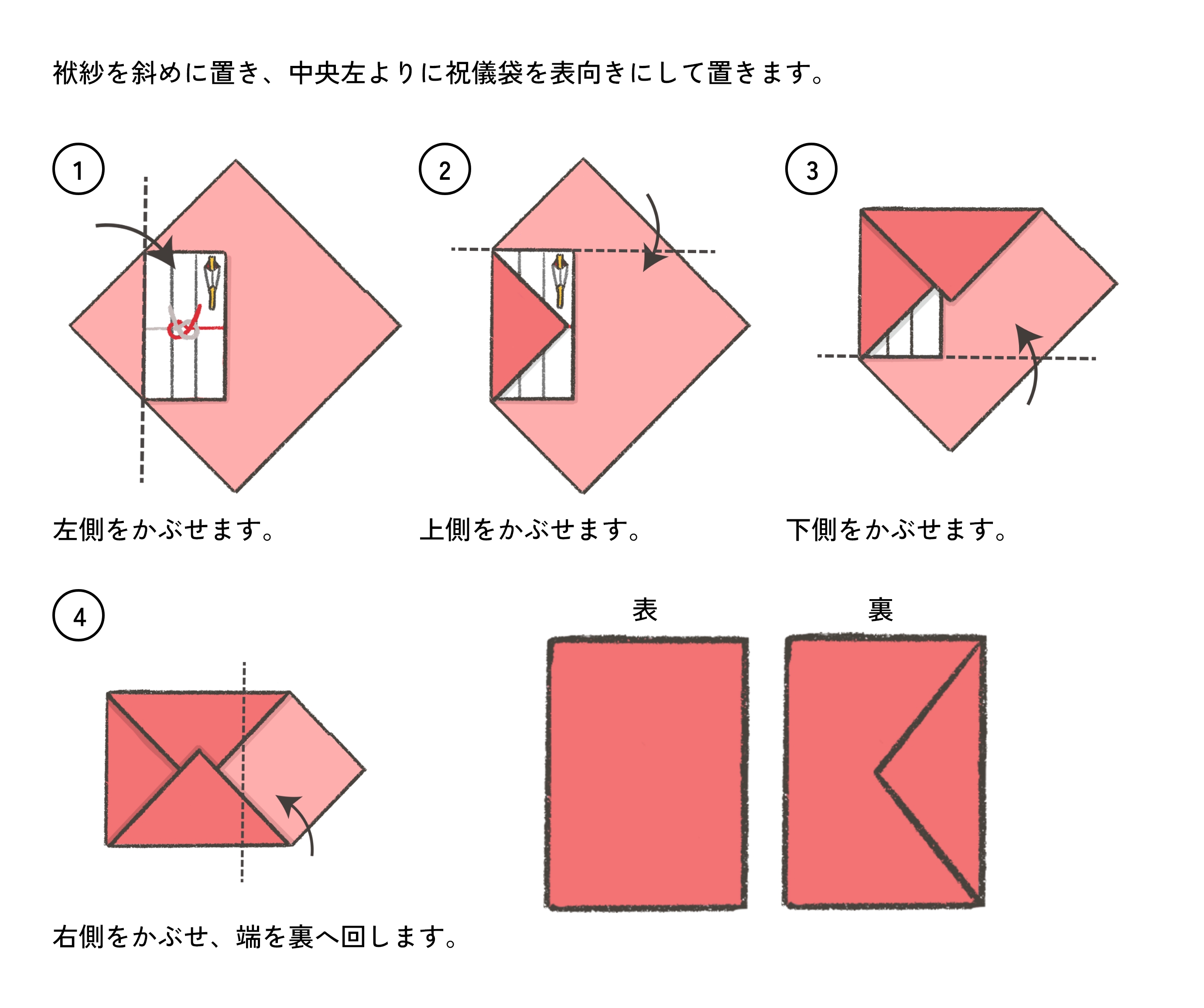 東京折や多当タイプの祝儀袋の場合は、裏面の折り返しが「受け折」(イラストのように裏面の折り返しの下部(①)が上部(②)に重なるように折る折り方)となるようにご注意ください。逆に折ることは弔事の際に使われる折り方なので注意が必要です。