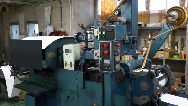 ロール状の巻き取り原紙を指定したサイズにカットする機械です。