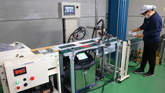 ロール状のJANや品名ラベルなどを製品の指定した場所に貼ることができる機械です。ロット番号を印字しながら貼り付けることも可能です。