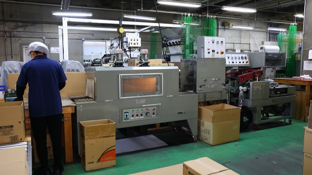 シール貼りやポリ袋入れ、検品など様々な作業をする工程です。一部内職加工は、自社で管理運営しています。