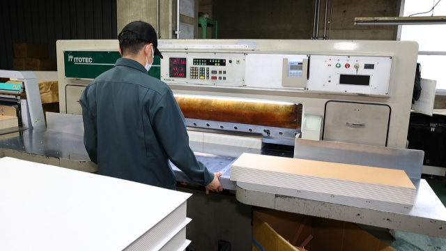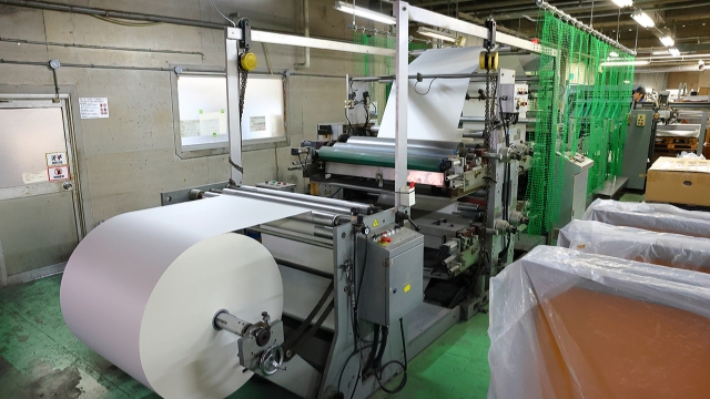 ロール状の巻き取り原紙を指定したサイズにカットする機械です。