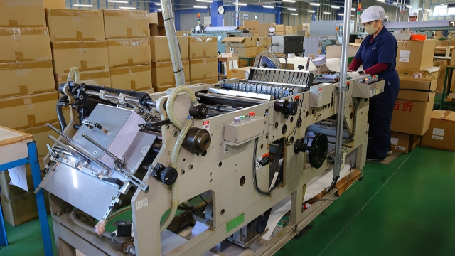 平判の紙に刃の付いた木型を押し当て、1枚ずつ切れ込みを入れる機械です。断裁機ではできない形に切れ込みを入れたり、折罫を入れることができます。